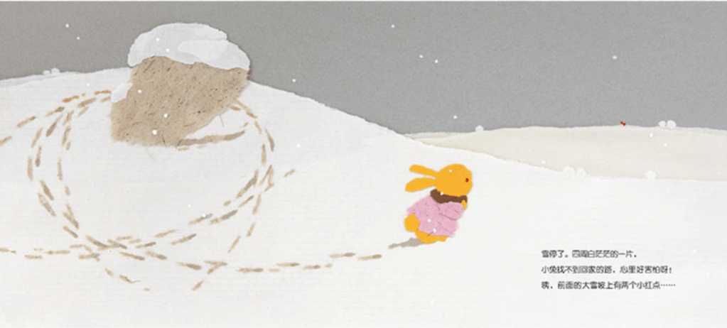 The little rabbit wishes to climb the large grassy slope. “Hey, why is the grassy slope in front higher than this one?” He wondered as he climbed and crawled up the big grassy slope. It was snowing heavily at the time, so how did the little rabbit find his way home?