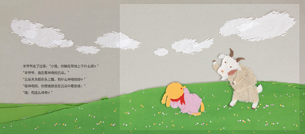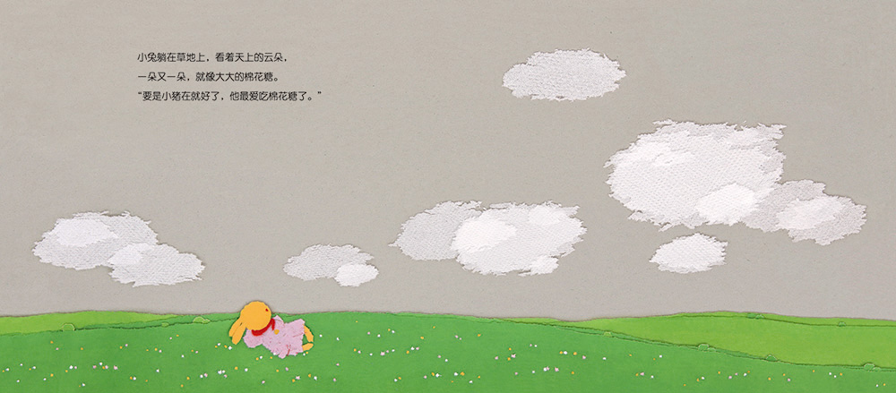 小兔躺在草地上,看着天上的云朵,一朵一朵就像大大的棉花糖。要是好朋友小猪在就好了,他最爱吃棉花糖了。咦?云朵好像变成了小猪在吃棉花糖,好神奇啊!小猪把这件神奇的事情告诉了羊爷爷和牛奶奶,他们也躺在草地上看起神奇的云朵来……