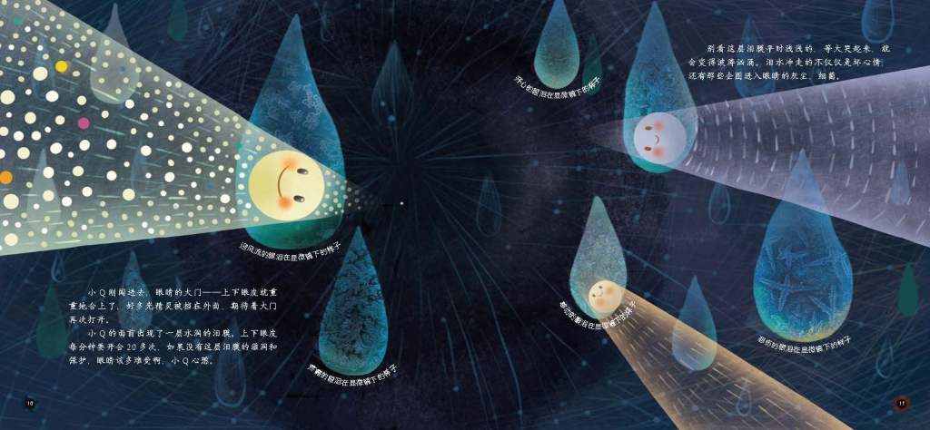 在《看!光精灵跑进眼睛里了》一书中,可爱的“光精灵”通过眼睛的不同部位进行了一次神奇的旅程,包括泪膜、巩膜(眼白)、角膜(瞳孔上的透明层)、虹膜、晶状体、玻璃体、视网膜、视神经和大脑,见证了光的奇妙之旅,只需要0.8毫秒。这本精美的生命教育图画书用童话般的语言阐述,我们的眼睛不仅仅是视觉的重要组成部分,更是我们身体和整个生命中不可或缺的部分,需要我们不断地关注和呵护。