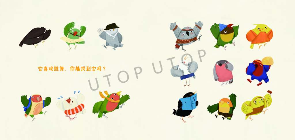 我有一只爱跟我玩捉迷藏的鸟。即使它被许多只黄鸟包围,我也能找到它。即使它藏在不同种类的鸟中间,我也能找到它。你呢?试试看吧!这是一个非常适合孩子们学习如何寻找特定物品的活动书。