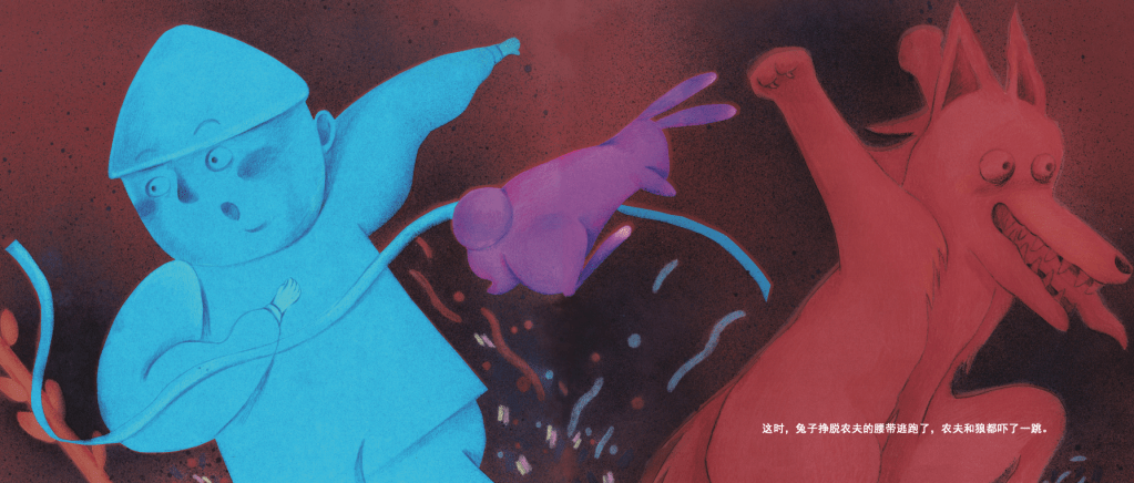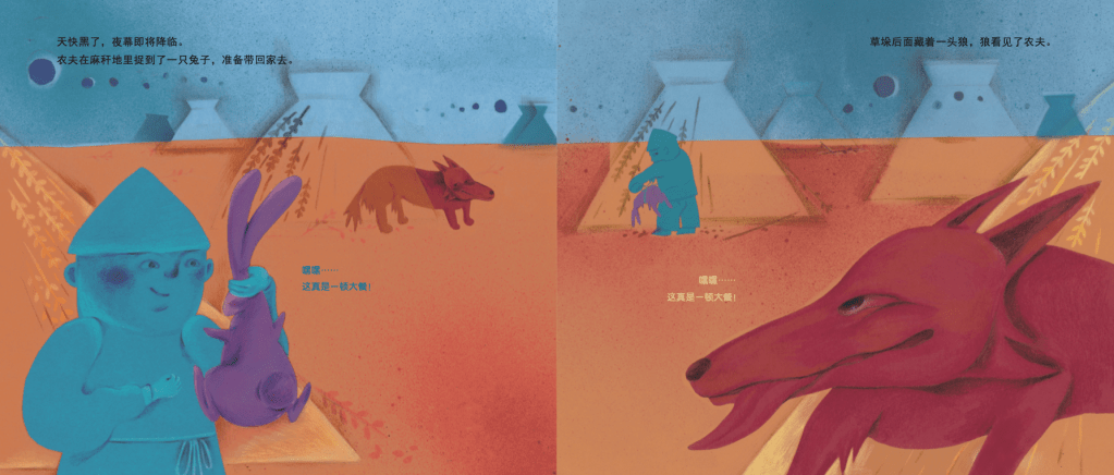 In a farmer’s unexpected adventure, he catches a rabbit only to realize a cunning wolf is tailing him. Armed with a stick, the farmer thinks it’s sturdy, but it turns out to be a mere hemp stalk. The wolf, seeing the stick, believes it’s an iron rod. As they cautiously size each other up, a chaotic showdown seems imminent. In their tense standoff, an unexpected sound from the haystack sends both the farmer and the wolf running in panic. Who will emerge as the victor in this psychological battle? This captivating story is adapted by the artist Liu Na from the folk saying “麻杆打狼两头怕 (Hemp Stalks and Wolves: Fear on Both Ends).”