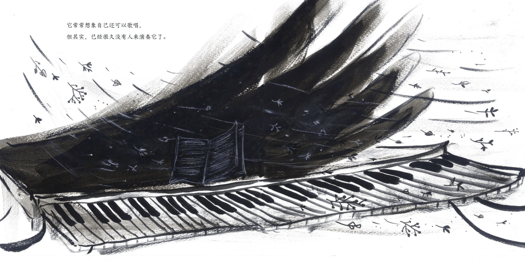 In the heart of the forest, there sits an old piano, its keys tangled with wild grass and covered in dirt. Long ago, this place was a bustling village, and the piano’s dearest friend was a little boy in a red hat. Together, they filled the air with beautiful melodies that brought joy to everyone around. But one day, the boy stopped coming…